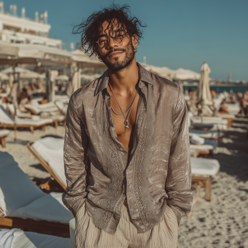 Benjamin | Men'S Casual Solid Color Tencel Patchwork Lace Lapel Loose Long Sleeve Shirt
