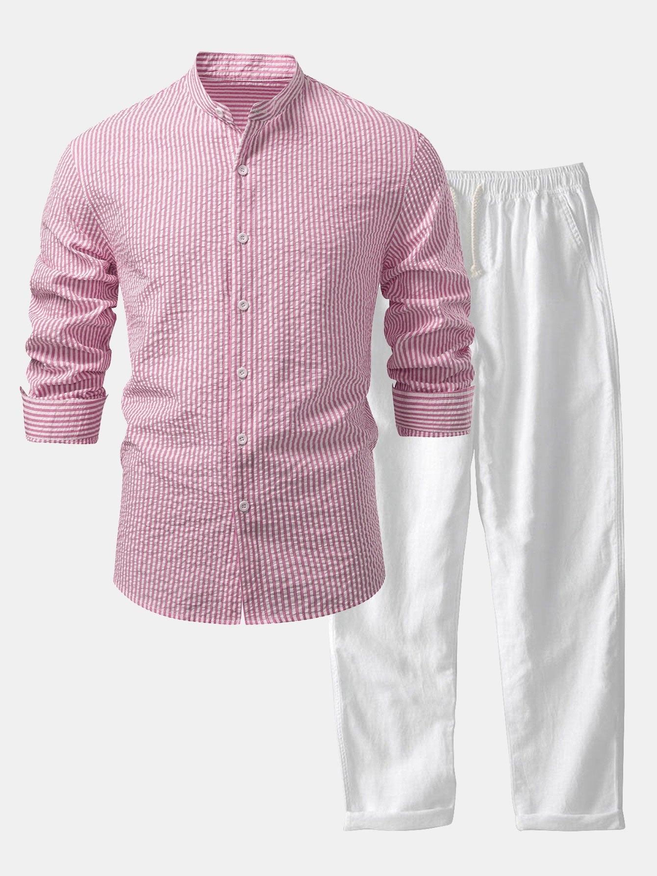 Iker® | Seersucker Striped Stand Collar Shirt & Straight Leg Linen Pants