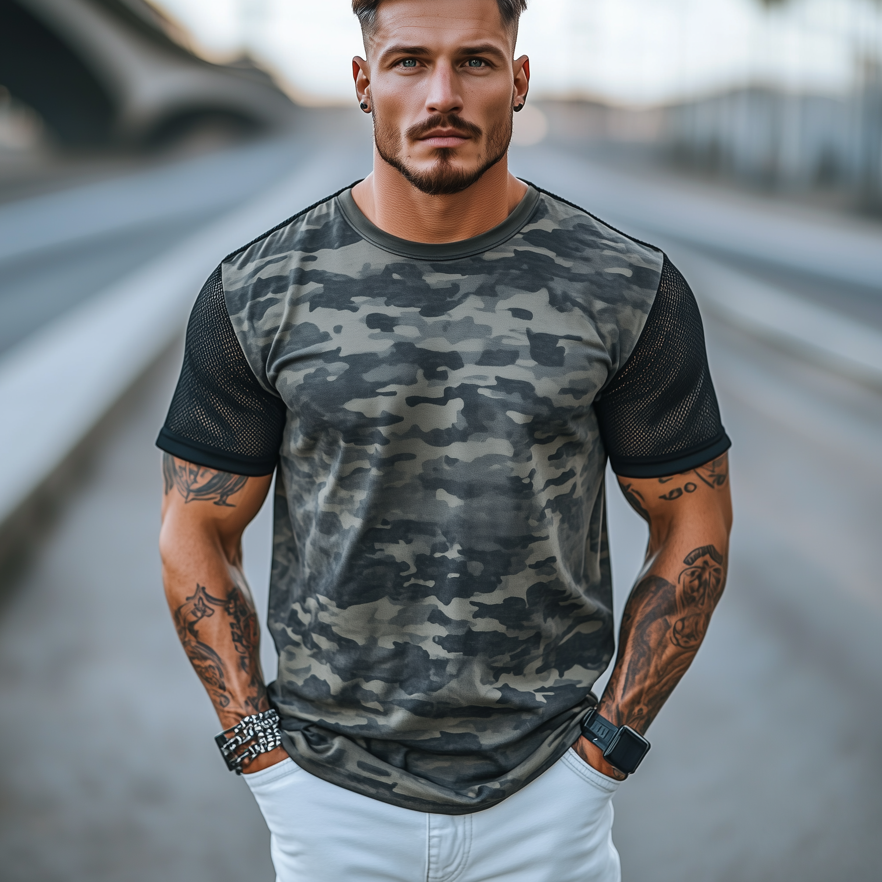 Stacy | Men'S Spring And Summer Casual Round Neck Camouflage Cotton Blended Splicing Mesh Short-Sleeved T-Shirt